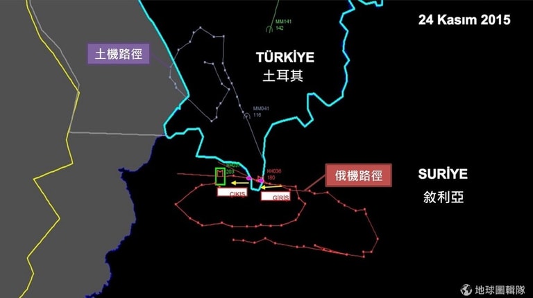 究竟,俄國戰機有沒有越界侵犯土耳其領空?俄國和土耳其都釋出他們自己的衛星照片,標示出戰機最後的飛行路徑。