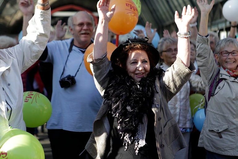 長者「快閃族」在城市中心的火車站廣場向公眾展示:老年也可以過得很cool !70歲的Christa(正中)連續兩年參與。攝: Rosa Maria Rühling