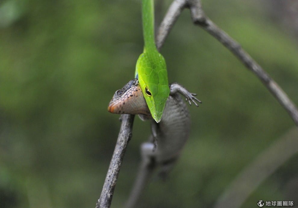 印度的寂靜山谷國家公園(Silent Valley national park)裡,一條綠蔓蛇(green vine snake)張口吃掉銅蜓蜥(Indian Forest Skink)。