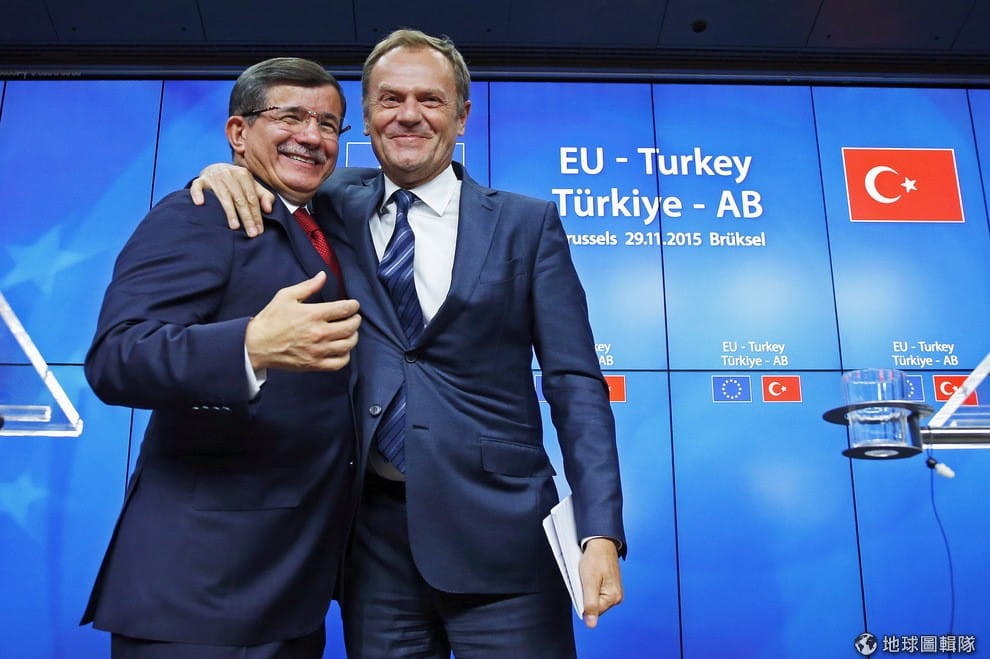土耳其總理達夫托葛魯(左,Ahmet Davutoğlu)和歐洲理事會主席圖斯克(Donald Tusk)摟著彼此的肩膀拍照。歐盟領導人 29號時在比利時與土耳其開會,會議中土耳其答應幫歐盟減少進到歐洲的難民人數,歐盟則會提供錢、簽證並重新考慮是不是要讓土耳其加入歐盟。歐盟提供給土耳其的 30億歐元(折台幣約1,036億),將會用來安頓土耳其境內 220萬名敘利亞難民。如果土耳其在未來 1年內,減少進到歐洲的難民人數並達到歐盟的其他要求,之後土耳其人不用申請簽證就可以到歐洲的申根區旅遊。