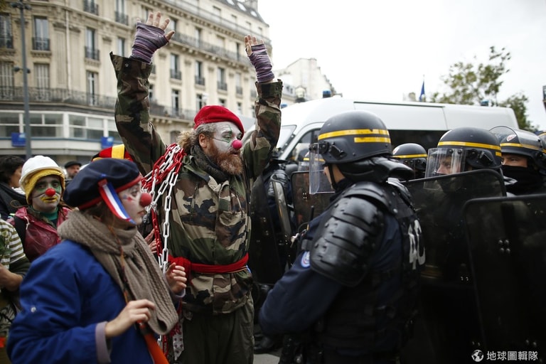 打扮成小丑模樣的環境保護家,站在共和國廣場周圍看著鎮暴警察。在巴黎遭到恐怖攻擊後,法國政府取消了原本預定要在聯合國氣候變遷大會(COP21)開跑前舉辦的氣候變遷大遊行。