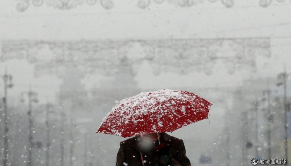 烏克蘭首都基輔下起白雪,一名女人撐著紅傘走在路上。