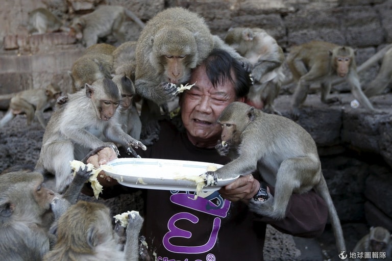 活動主辦人拿著水果盤,數隻長尾獼猴(Long-tailed macaque)爭著從他的盤子裡拿水果來吃。每年,泰國的三峰塔(Pra Prang Sam Yot temple)都會舉辦「猴子吃到飽」節日慶祝活動,提供食物給當地的 2,000多隻猴子享用,感謝牠們吸引大批遊客到鎮上旅遊。