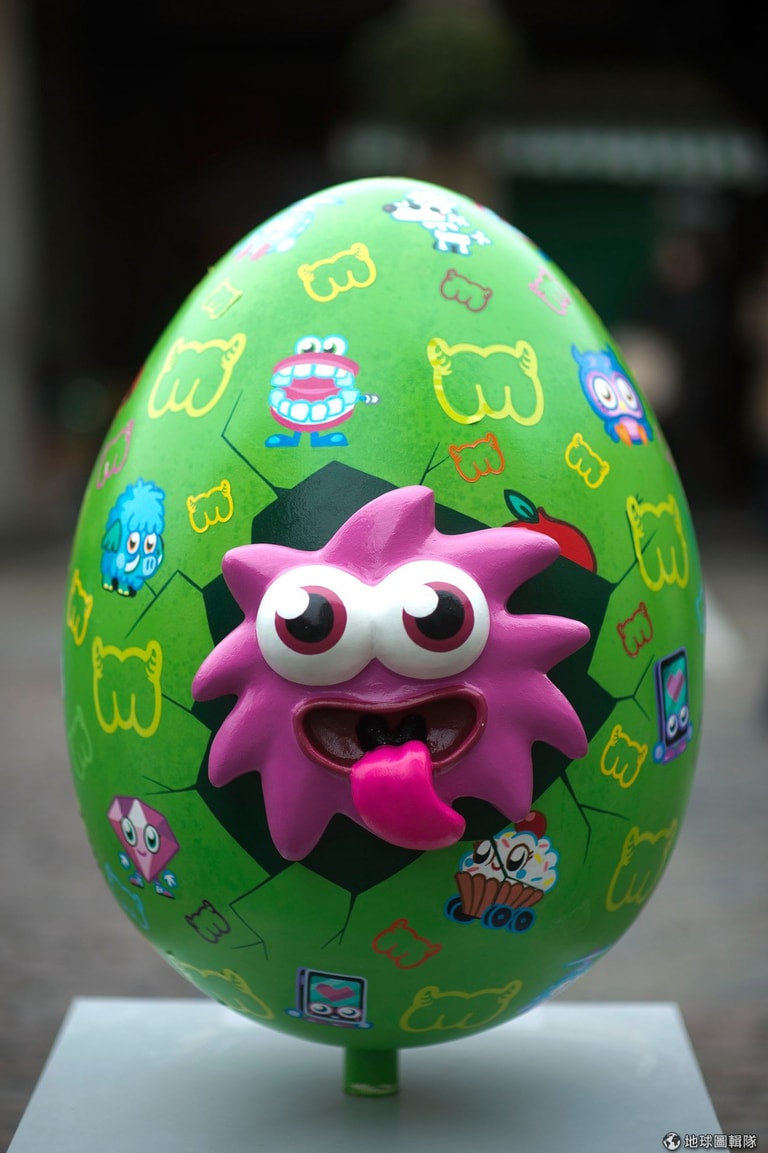 歐美小朋友瘋狂的社群遊戲Moshi Monster角色也出現囉!這展品名稱是"Iggy Eggy"。Bethany Clarke/Getty Images