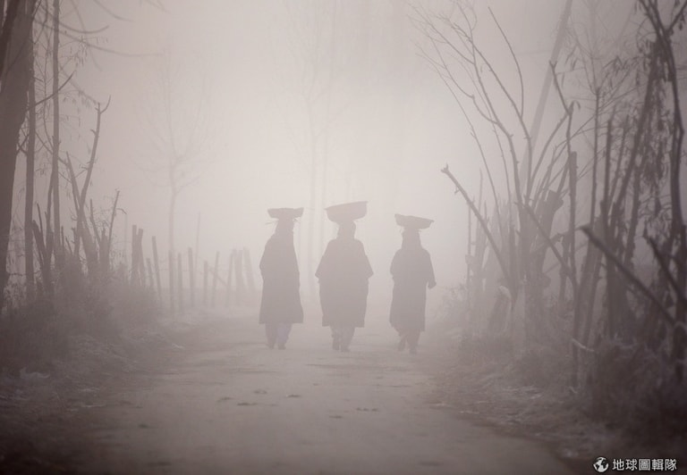 三名喀什米爾女性頭頂著籃子,走在清晨的薄霧中。
