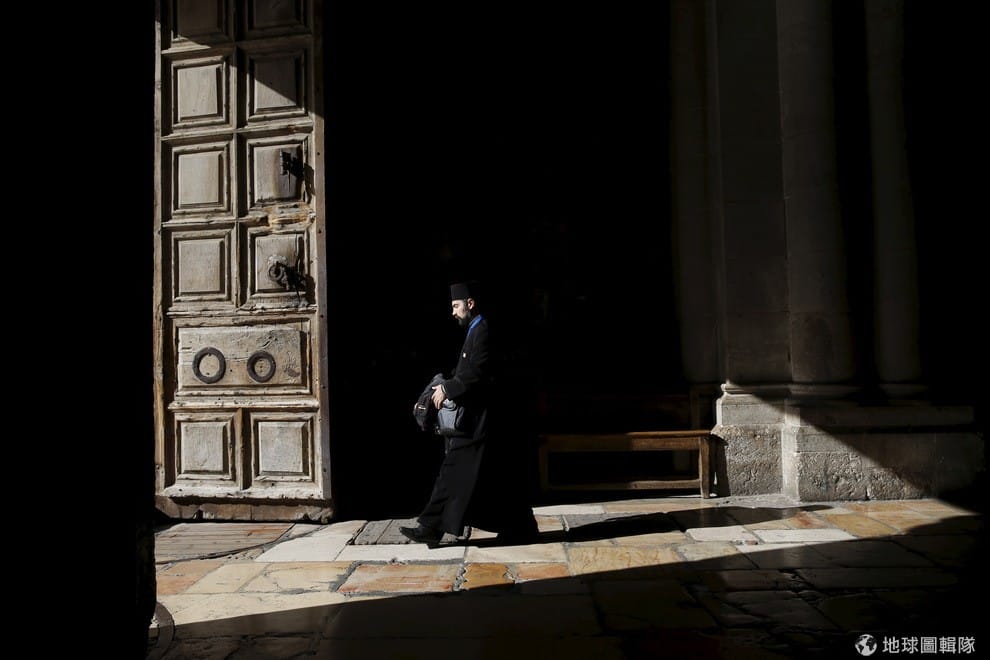 一名東正教教士走出聖墓教堂(Church of the Holy Sepulchre)。根據《維基百科》介紹,有許多基督徒認為聖墓教堂是耶穌基督被釘死的地方,同時也是耶穌埋葬後復活的地方。因為耶穌,聖墓教堂成為基督教重要的朝聖地點,從 4世紀開始就不斷有人來膜拜。