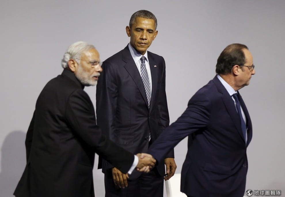 氣候變遷大會上,法國總統歐蘭德(右1,Francois Hollande)牽著印度總理莫迪(Narendra Modi)走下台。氣候變遷大會在法國巴黎開跑,21國領導人首先發表「創新使命」(Mission Innovation)承諾,承諾將會大幅增加各國公私部門的再生能源投資。