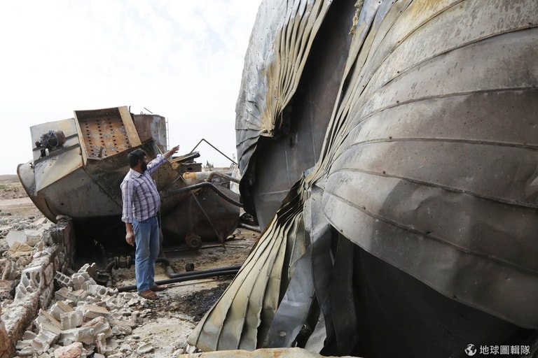 一名男子在敘利亞看著被聯軍空襲的煉油廠。