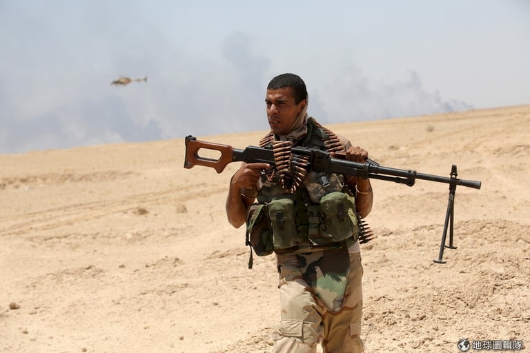 一名伊拉克軍人全副武裝,準備上場對付伊斯蘭國武裝分子。