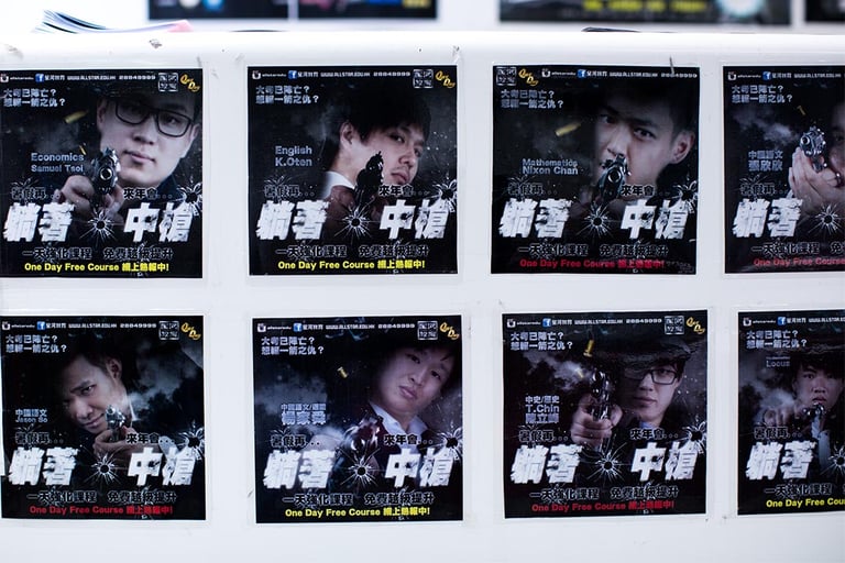 所費不菲,補習班也競相爭取更多學生,一些補習社的官網賣弄溫情:「我們在乎的是你:是否能錄取到理想(大學)校系,並完成夢想?」這些看來人性的廣告,捕捉的是每一個學生在考試戰場上「拿高分」的痛點。