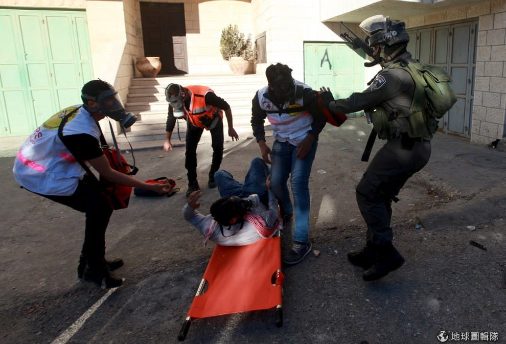 一名以色列邊界警察阻止醫護人員將受了傷的巴勒斯坦示威者送醫。這名示威者在约旦河西岸城市伯利恆與以色列邊界警察發生衝突,遭警察槍擊受傷,被拘留後獲釋。
