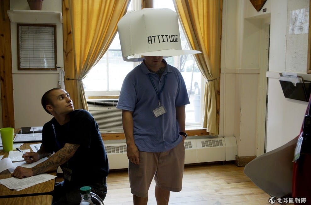 一名在治療中心接受治療的男子帶著寫有「態度」二字的紙帽,提醒自己要注意暴躁的脾氣。來到這裡的人通常有毒癮和酒癮,常常將自己的人生搞得一團糟,有人更因此多次進出監獄,他們來到治療中心希望可以擺脫過去的壞習慣,迎接嶄新的人生。同時,他們也希望可以透過家庭團體治療、冥想和信任遊戲重新融入社會。