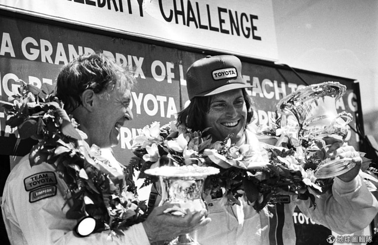 美國傳奇賽車手格尼(左)在 1982年的賽事結束後,將榮耀一起分享給身旁的任納,任納曾創下奧運十項全能世界紀錄,他於 2015年變性並改名。
