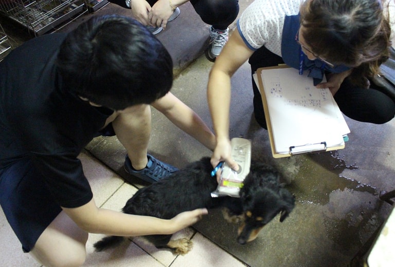 動保檢查員為疑似非法繁殖的犬隻掃瞄晶片。 李娉婷/攝