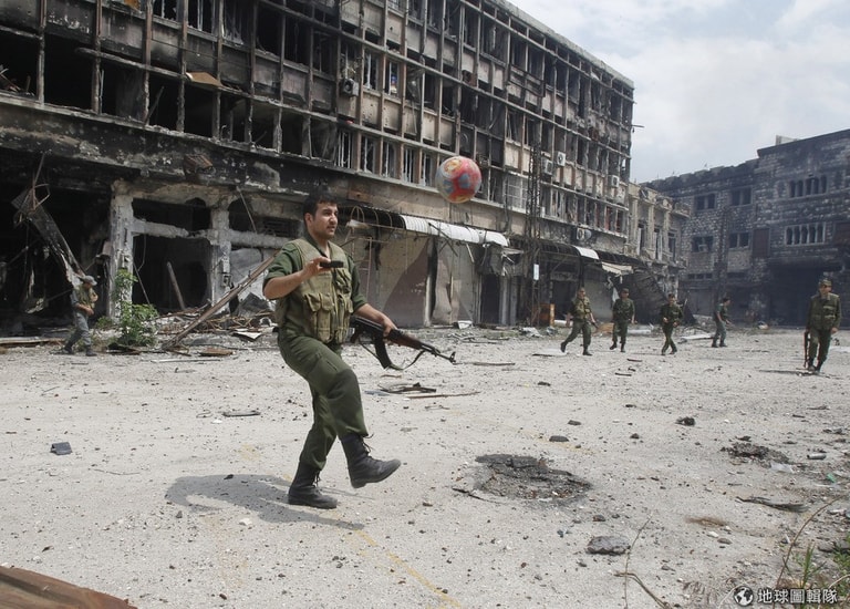 霍姆斯城內,正在玩球的叛軍。這次叛軍撤離阿爾瓦爾區對敘利亞政府來說意義非凡,因為他們等於收復了曾是反政府軍駐紮的重地。
