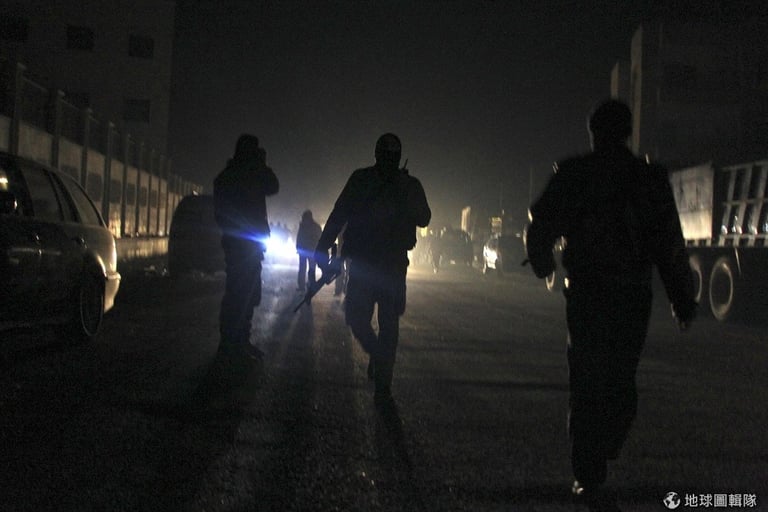 霍姆斯市區內,逆光而行的叛軍。