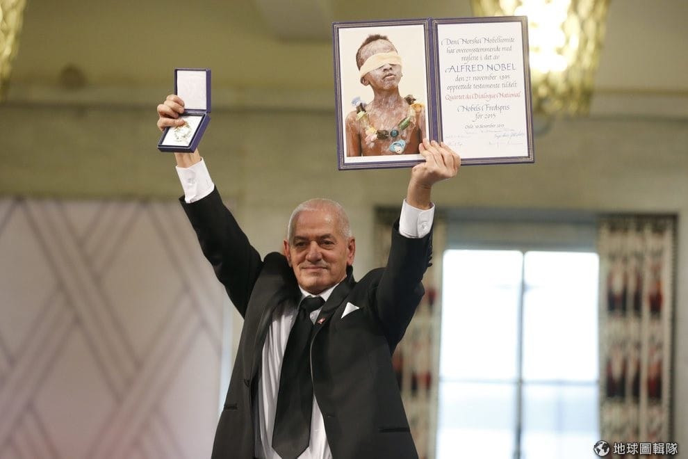 突尼西亞總工會(UGTT)秘書長亞巴西(Houcine Abassi)高舉諾貝爾和平獎證書和獎章。今年的諾貝爾和平獎頒給了對突尼西亞民主有貢獻的突尼西亞全國對話四方集團(The Tunisian National Dialogue Quartet),其中就包含了突尼西亞總工會,他們是 2011年茉莉花革命後穩定社會的一股力量。