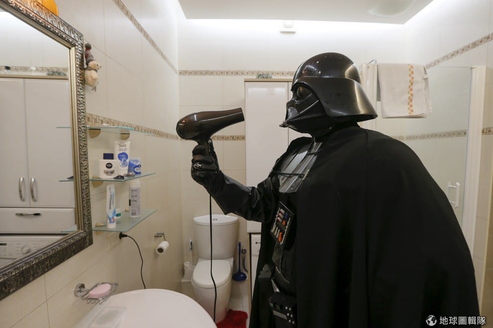 一名著迷於《星際大戰》的星戰迷發揮創意,將自己打扮成電影中的反派角色黑武士融入日常生活中,圖為他在浴室拿著吹風機吹乾頭盔。這名星戰迷不只將自己的名字改成黑武士,還以這身裝扮競選當地市長,他的支持者則打扮成帝國風暴兵的模樣為他助陣。