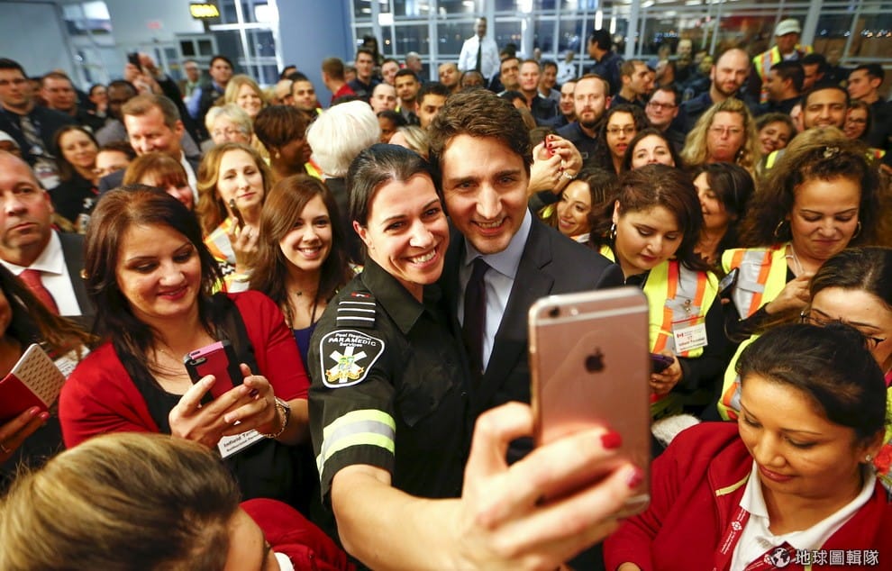 新任總理杜魯道(Justin Trudeau)在多倫多皮爾遜國際機場等待遠渡重洋的敘利亞難民時,和機場員工一起自拍。在好幾個月的規劃和準備後,第一批敘利亞難民總算抵達加拿大和總理杜魯道見面。