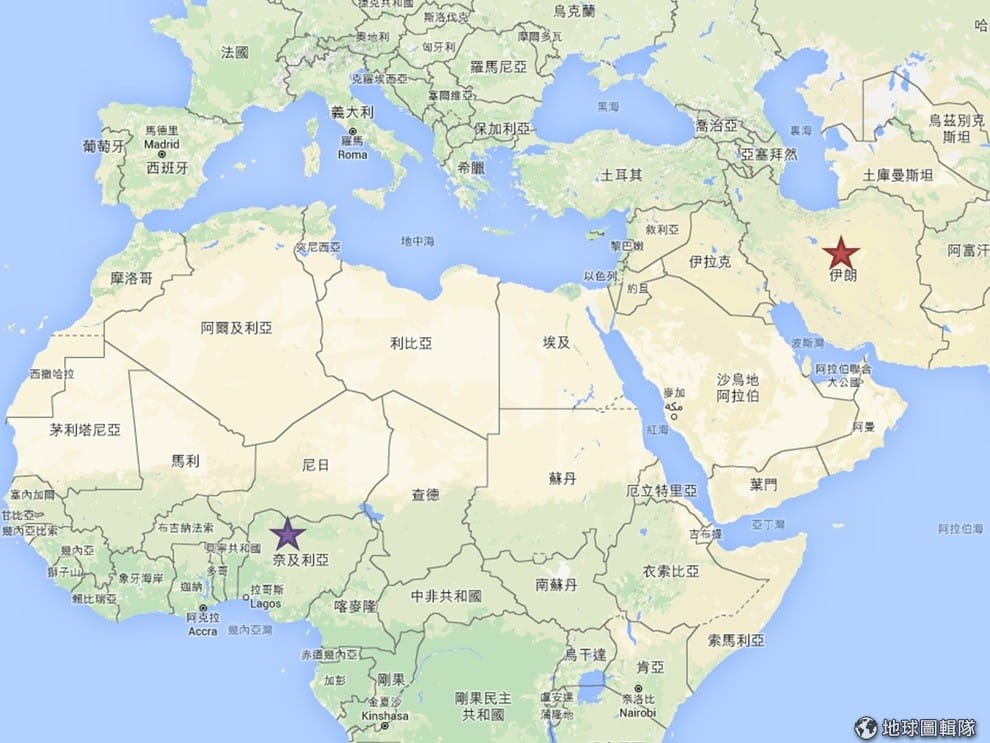 奈及利亞(紫色星星處)與伊朗(紅色星星處)距離遙遠,最近卻因為奈國的一個衝突感情不和。