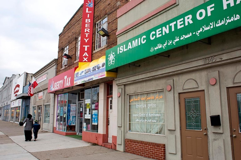 一名婦人和小孩在Joseph Campau大道上的哈姆特拉米克伊斯蘭中心前走過。攝 : Laura McDermott/端傳媒