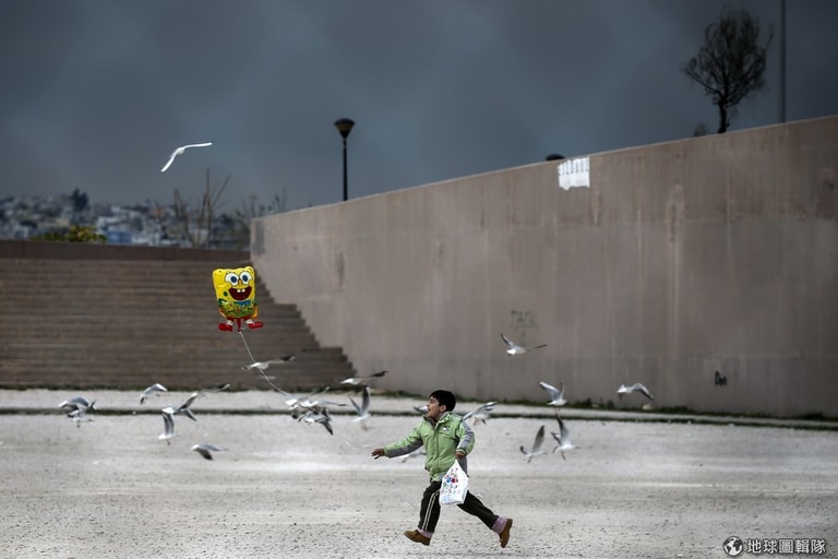 遠渡重洋逃到歐洲的難民小朋友在法利羅海濱區奧林匹克體育中心旁,追著一顆海綿寶寶造型的氣球。面對越來越多難民湧入歐洲,各國紛紛大喊吃不消,就連一向對難民展開雙臂的德國日前也宣布,要開始對難民設限,降低接收難民的人數。