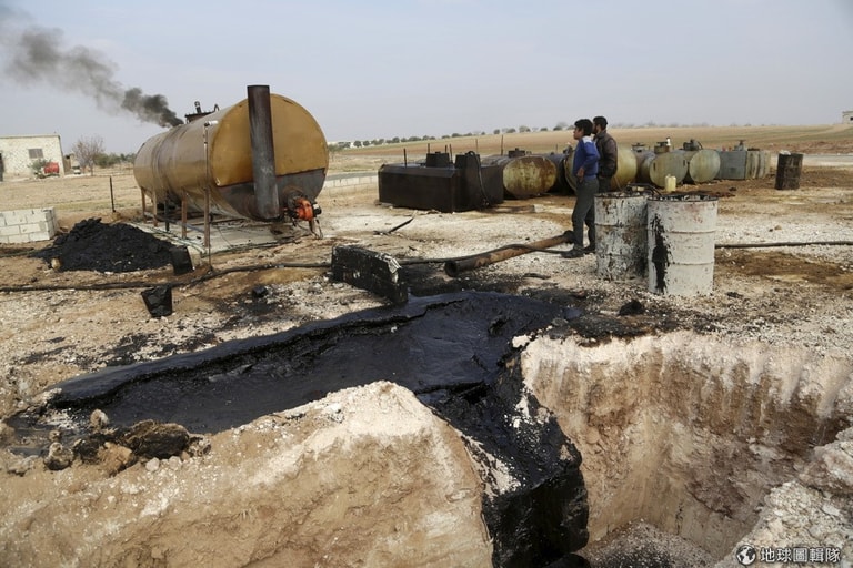 兩名男子看著位於敘利亞北部伊德利卜省(Idlib)的臨時煉油廠。今年 34歲的阿尤布(Yousef Ayoub)是煉油廠的老闆,他說這座臨時煉油廠已經運轉四個月了,他從伊斯蘭國(IS)控制的區域和伊拉克取得原油精煉後賣出,價格時常變動而且受伊斯蘭國控制,但平均在每桶 44美元(折台幣約 1,432元)間。