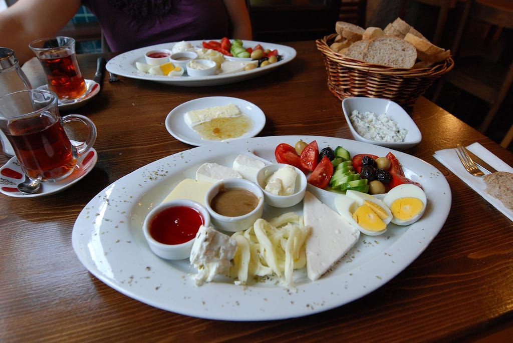 傳統土耳其早餐以麵包和紅茶為主,再配上起司、奶油、黑橄欖、雞蛋、番茄、小黃瓜、果醬、蜂蜜和有名的奶油Kaymak,如果想吃點重口味的,就可以配上辣辣的土耳其香腸。