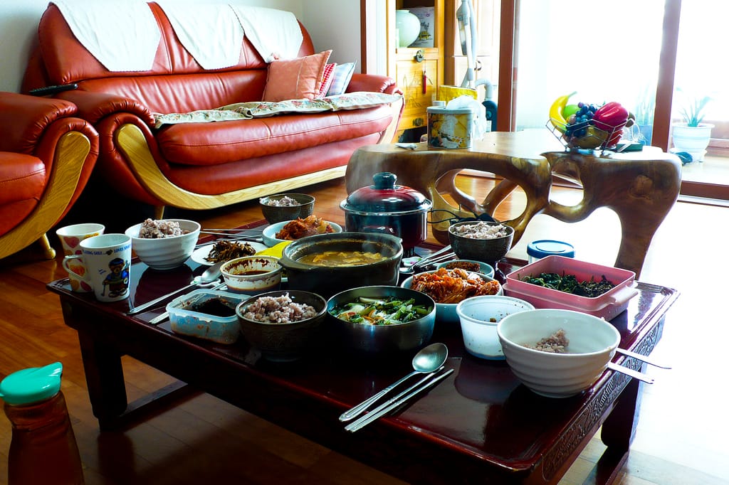 南韓的早餐與晚餐其實差異不大,他們會在一早就在桌上擺上豐盛的菜色:湯、飯、魚、肉以及永遠都要隨侍在旁的泡菜,有時候也會將前一晚剩下的剩菜殘羹一起帶入早餐。