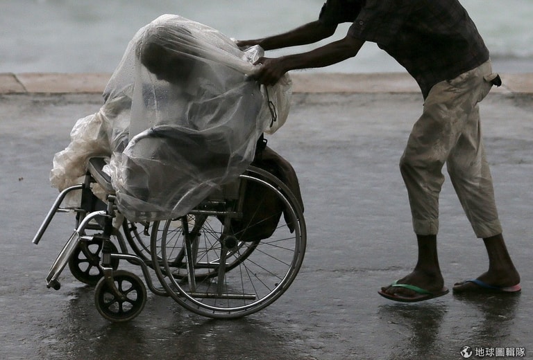 可倫坡市區內,一名男子在大雨中推著輪椅前進,輪椅上的人被罩上塑膠布。