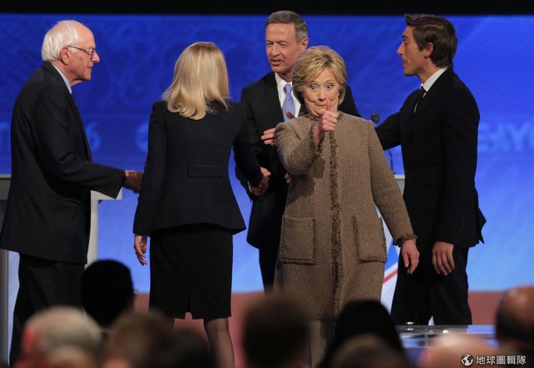 新罕布什爾州的聖安瑟倫學院(St. Anselm College)校內,可見美國民主黨總統候選人希拉蕊與民眾比出大拇指,她身後另一位民主黨總統參選人桑德斯(Bernie Sanders,左一)正與前新罕布什爾州長歐邁利(Martin O'Malley)、辯論主持人拉達茲(Martha Raddatz,左二背面)和穆爾(David Muir,最右)握手寒暄。美國 2016總統大選在即,民主黨和共和黨候選人們都在為黨內初選努力中。