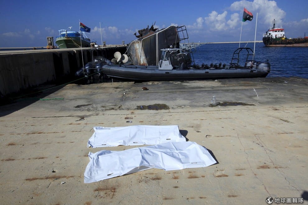 的黎波里(Tripoli)海港旁,兩具遺體被放進屍袋中,他們是想要渡海的難民,但剛離岸不久就出現沉船意外而不幸喪生。