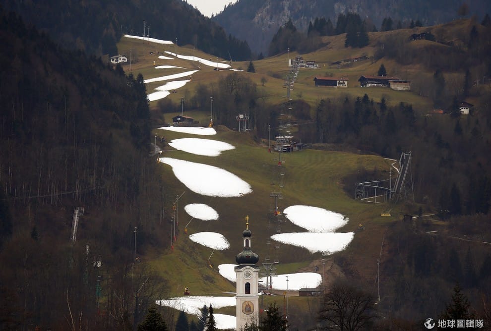 上奧多夫(Oberaudorf)一處滑雪場上,只見綠草地上有著一塊一塊的人造雪。入冬的德國未見平時的寒冷,當地氣象局指出今年的聖誕節可能會有攝氏 15度的氣溫出現。