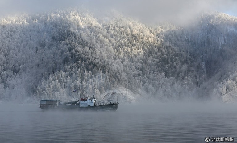 攝氏零下 20度的葉尼塞河(Yenisei River)上,一艘船緩緩駛過籠罩霧氣的河面,遠處可見整片因低溫結霜的樹林。