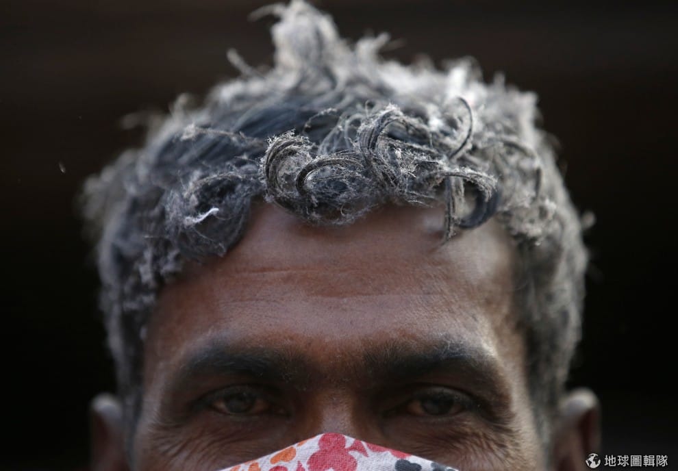 一頭棉絮的移工看向攝影師,他來自印度,正在加德滿都一處工廠利用回收棉花製作毯子。