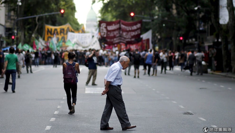 老人家緩步走過五月廣場(Plaza de Mayo square),遠處可見正在抗議現任總統馬克里(Mauricio Macri)經濟政策的民眾。