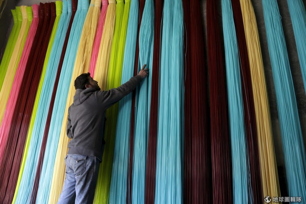 叛軍把持的伊德利卜省(Idlib)當地,可見民眾正在檢視一會兒要製作成地毯的塑膠繩,伊德利卜省一直是敘利亞境內重要的地毯製造地,過去多銷往鄰近國例如伊拉克等地,但當地攤商表示,近期因為砲火太劇烈導致訂單下滑。