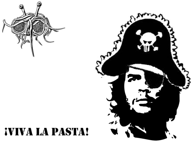 飛麵神教的神是一團會飛的義大利麵,身上配有 2個肉丸子並長著大大的眼睛。信徒們頭上戴著濾水盆(colander)並崇敬海盜,他們相信天堂有一座會噴出好啤酒的火山,地獄有一座噴臭酸啤酒的火山。