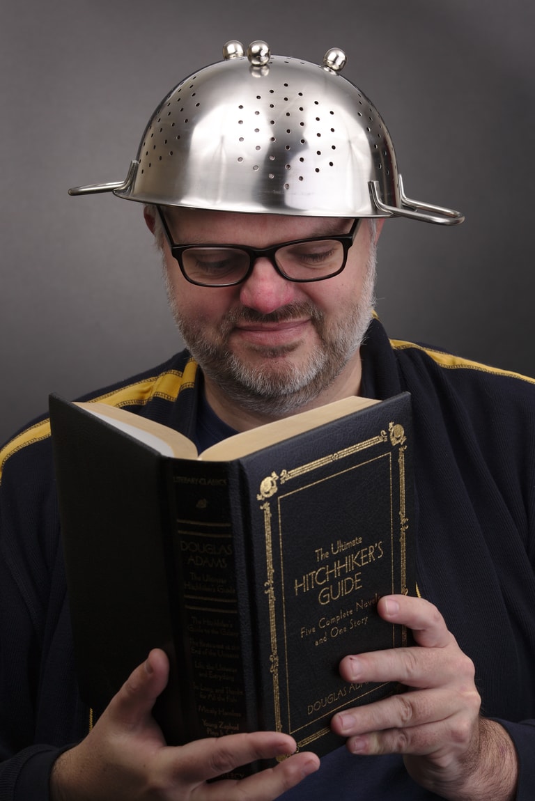 她接著聊到飛麵神教的婚禮,描述婚禮宴客的食物是飛麵神教的聖餐「義大利麵」,來參加婚禮的人可以在頭上戴濾水盆,或是打扮成海盜的樣子,因為飛天麵神創造的第一個人類正是海盜。