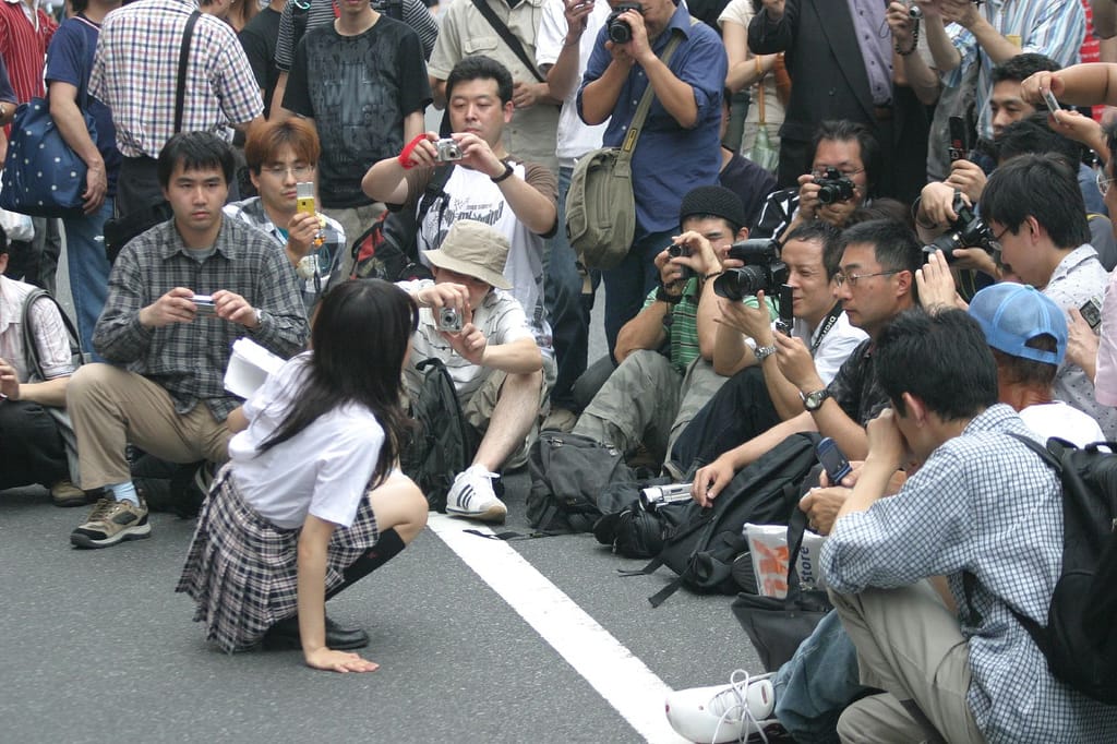 秋葉原路邊一群對著模特兒拍照的民眾。