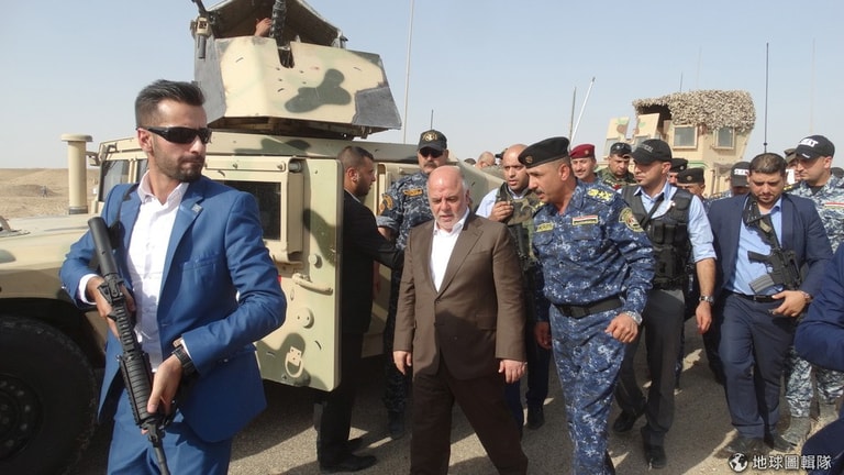 伊拉克維安人員護送伊拉克總理阿巴迪(棕色上衣)視察戰區。