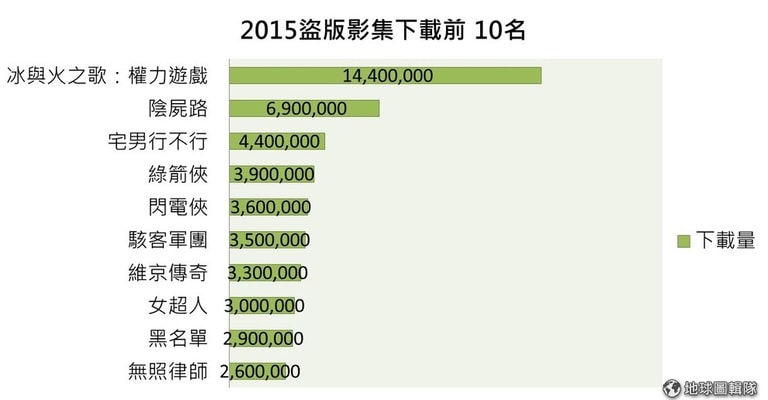另外,盜版追蹤網站TorrentFreak也統計了今年盜版影集下載次數,宣布 2015年在BitTorrent被下載最多次的是奇幻影集《冰與火之歌:權力遊戲》,下載量高達 1,440萬次;緊追在後的是殭屍影集《陰屍路》,下載量有 690萬;第 3名的《宅男行不行》以 440萬的下載量登上排行榜。