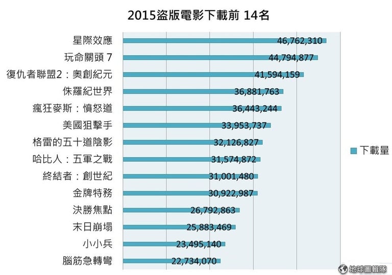 最讓電影業擔心的,也許是今年盜版整體下載量比去年還要多,單看這兩年的排行榜冠軍下載量,2014年第一名的《華爾街之狼》下載量只有 3千萬,跟今年的第一名《星際效應》相比足足少了 1,600萬。