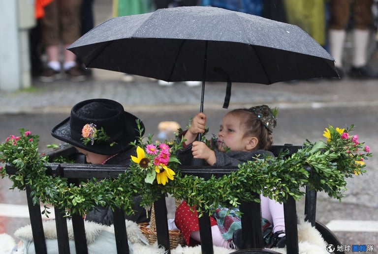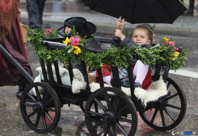 穿著傳統服飾的小男生,坐在花車裡面。圖片來源:Johannes Simon/Getty Images