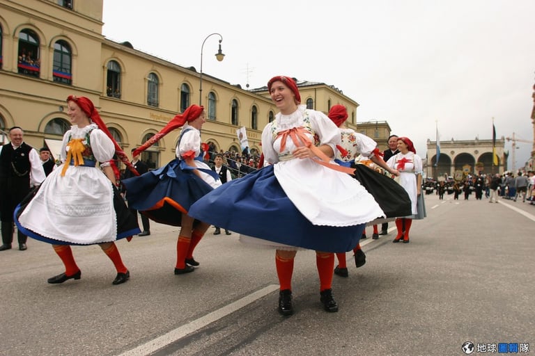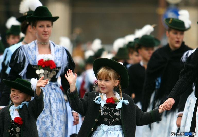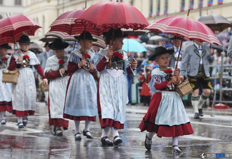 穿著德國傳統女性服飾的表演者正在隨著遊行隊伍邊前進邊跳舞。圖片來源:Sebastian Widmann/Getty Images