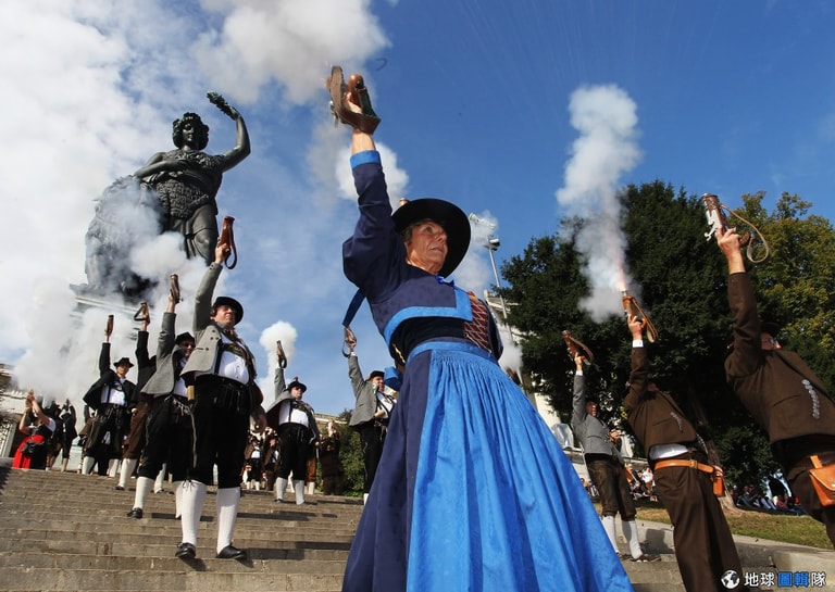 已經有200多年歷史的德國啤酒節,最早起源於1810年,當時為了慶祝路德威國王一世(King Ludwig I)的婚禮而開始了這項活動,而歷經世界大戰、疫病的這項活動也曾前前後後停辦了20多次。照片中來福槍表演者正在當地有名的「巴伐利亞」雕像前鳴槍。圖片來源:Alexandra Beier/Getty Images