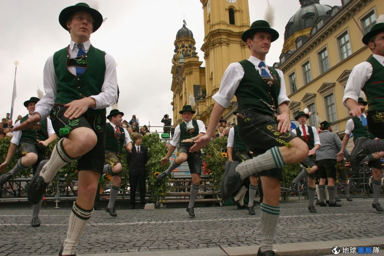 穿著德國男性傳統服飾的表演者正在隨著遊行隊伍邊前進邊跳舞。圖片來源:Sebastian Widmann/Getty Images