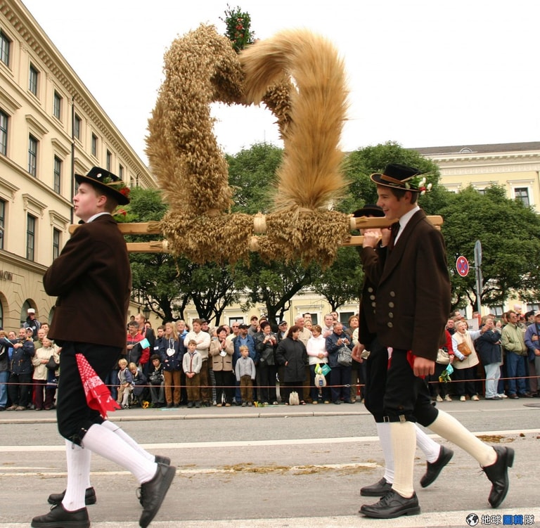 傳統服裝打扮的年輕人們,正抬著用小麥編城的皇冠遊行,啤酒節中很重要的一項活動就是當地傳統農業文化的展示。圖片來源:Sebastian Widmann/Getty Images