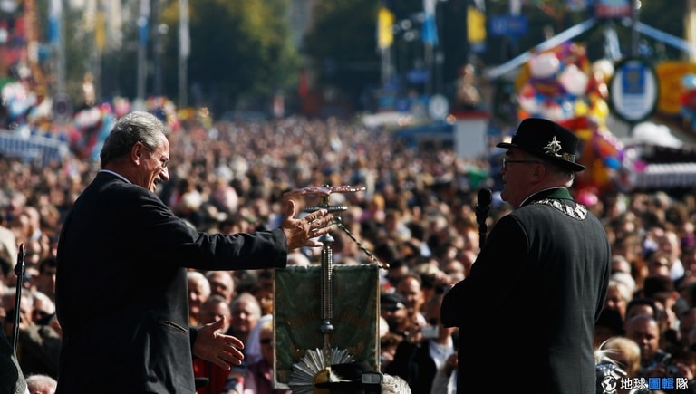 活動一開始一定要邀請官方來致詞一番,圖中是慕尼黑的市長(左),他正在歡迎所有參加活動的觀光客和當地的民眾。圖片來源:Alexandra Beier/Getty Images