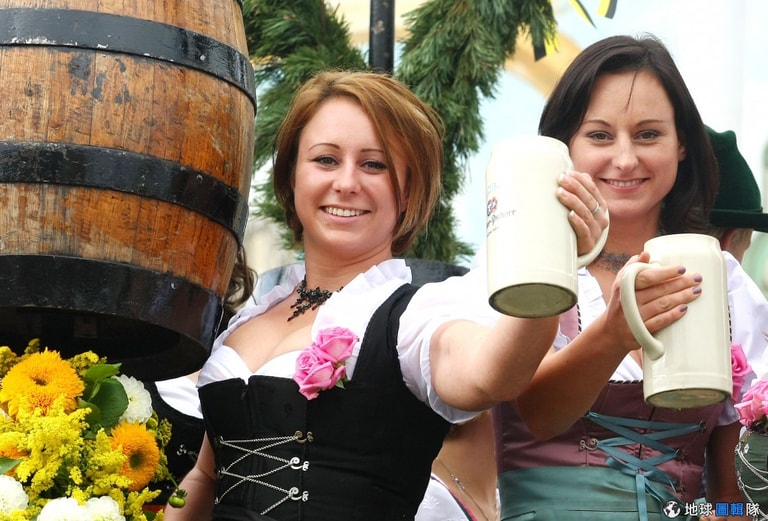 遊行隊伍中,拿著啤酒馬克杯的女生們跟旁邊的群眾打招呼。圖片來源:Johannes Simon/Getty Images